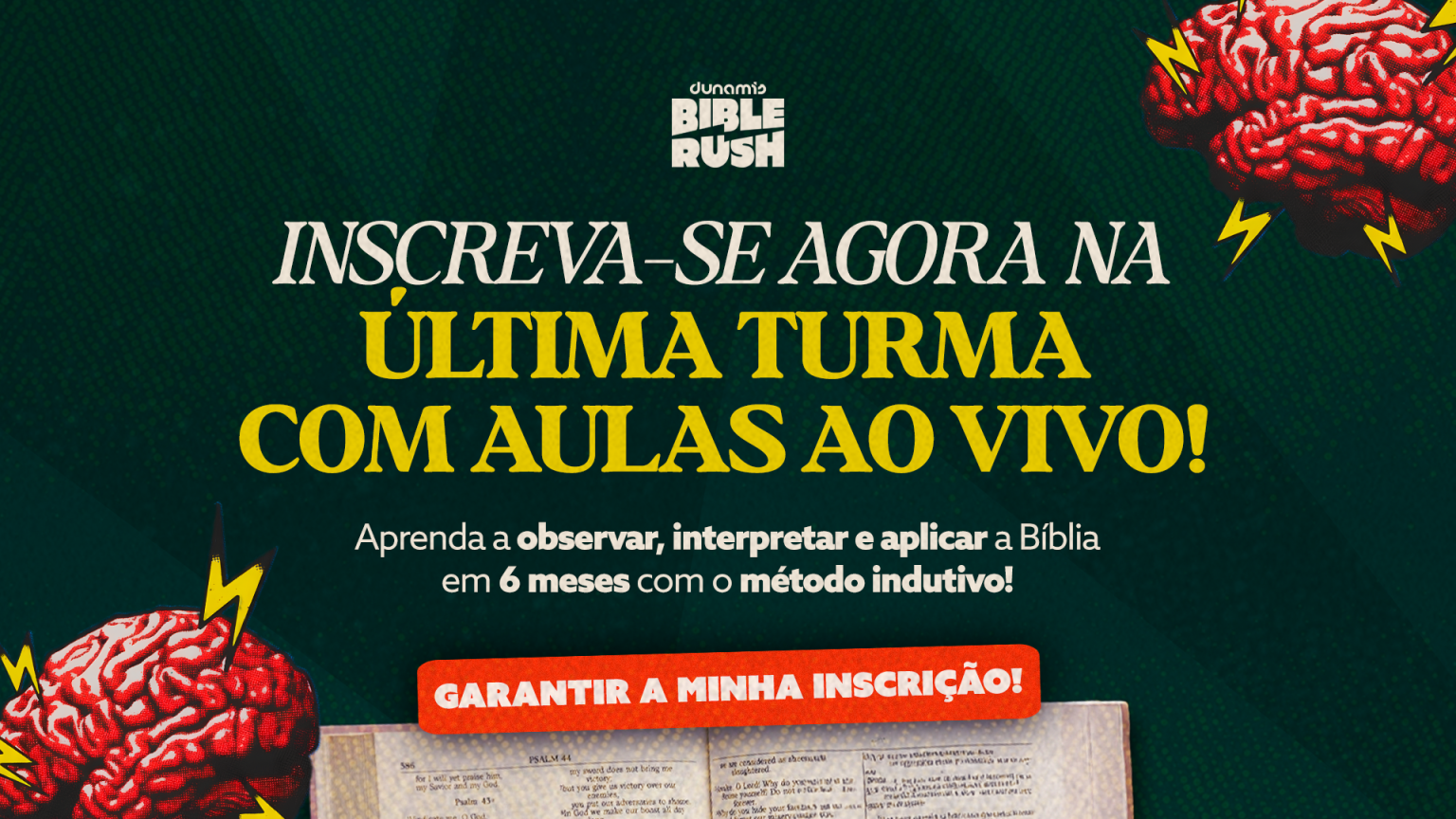 O método de estudo indutivo é um processo que envolve observar o texto bíblico cuidadosamente, interpretar seu significado original e aplicar os princípios encontrados à vida pessoal. No Dunamis Bible Rush, esse método será ensinado nas aulas ao vivo semanais, permitindo que você aprenda a estudar a Bíblia por conta própria e proclamar essas verdades a outros.